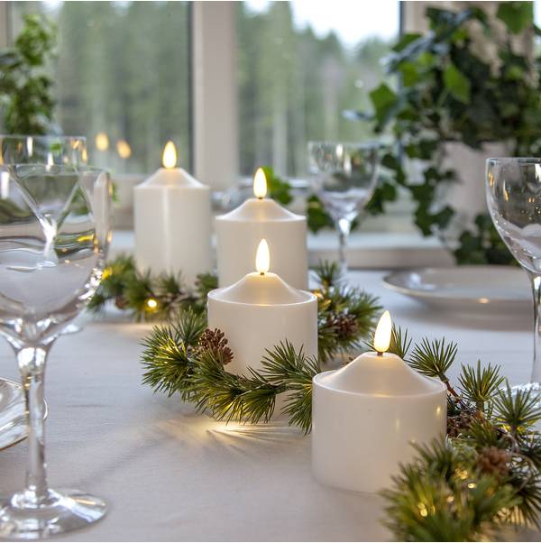 Flamme Top vaxlys i vår Flamme-familie, med naturtro flamme som lyser opp med varm hvit glød. Lyset har innebygd timer. Høyde inkludert flamme er 9,5 cm. Unngå å plassere lysene i direkte sollys da de kan smelte og misfarges av varmen.