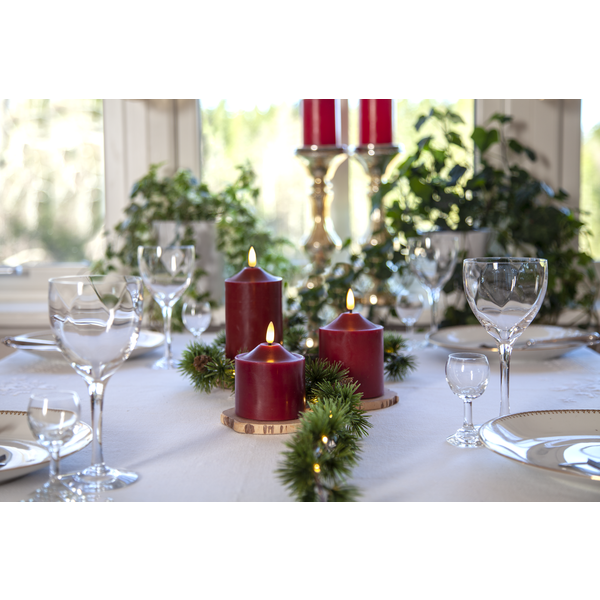 Flamme top er et vokslys i mørkerød farge. Lysets størrelse er ca. 7,5 cm i diameter og høyden inkludert flamme er ca. 9,5 cm. Dette batterilyset blir en vakker dekorasjon, både alene og i gruppe sammen med de andre lysene fra vår Flamme-serie. Det har timerfunksjon, og når bryteren er på timermodus lyser lyset i ca. 30 dager med en vakker, realistisk flamme i varmt hvitt. Det drives av 2 AA-batterier, disse følger ikke med. Unngå å plassere lysene i direkte sollys da de kan smelte og misfarges av varmen.