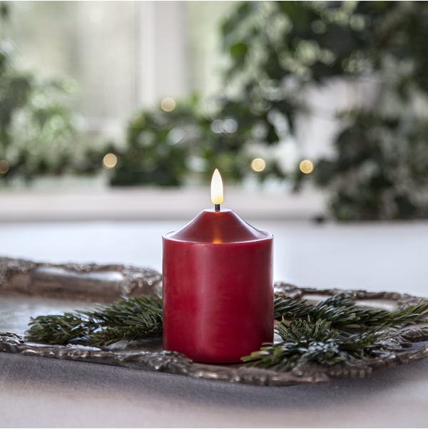 Flamme Top er et vokslys i mørkerød farge. Lysets størrelse er ca. 7,5 cm i diameter og høyden inkludert flamme er ca. 12 cm. Dette batterilyset blir en vakker dekorasjon, både alene og i gruppe sammen med andre lys fra vår Flamme-serie. Det har timerfunksjon, og når bryteren er i timermodus, lyser lyset i ca. 30 dager med en vakker realistisk flamme i varmt hvitt. Det drives av 2 AA-batterier, som ikke er inkludert. Unngå å plassere lysene i direkte sollys, da de kan smelte og misfarges av varmen.