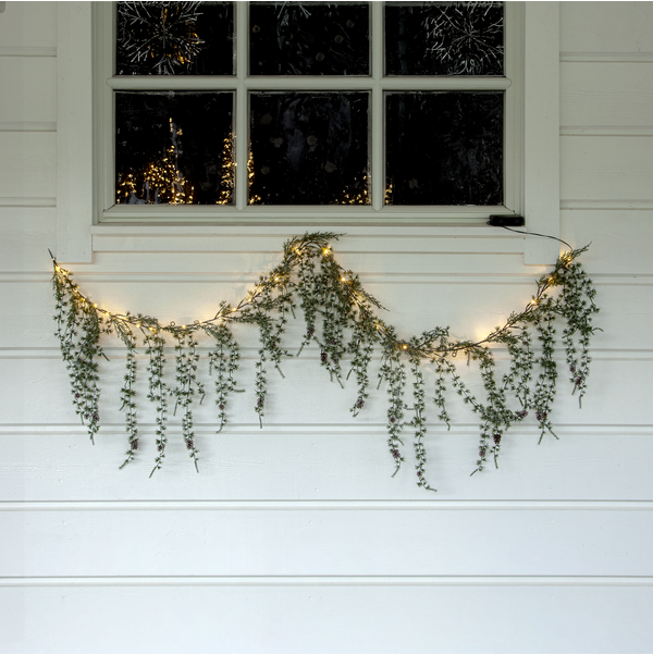 Girlang Barr på lengden 170 cm har grener som er lange og sveipende. Disse er laget i PE-materiale, som er et godt miljøvalg. Med 30 varmhvite lys kan den brukes både utendørs som en vanlig girlander eller innendørs som en veggdekorasjon. Hvis man velger å henge den horisontalt, blir målene ca. 170x50 cm. Girlanderen drives av 3 AA-batterier og har også timerfunksjon, og når bryteren er på timermodus lyser girlanderen i ca. 25 dager. Batterier følger ikke med. I Barr-familien har vi også en krans.
