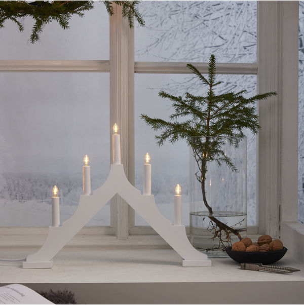 Hvitt adventsstake laget av tre. Klassisk formet lysestake med moderne preg. Vakkert lys som skaper den perfekte julestemningen i vinduet ditt. Dette produktet har FSC®-merking.