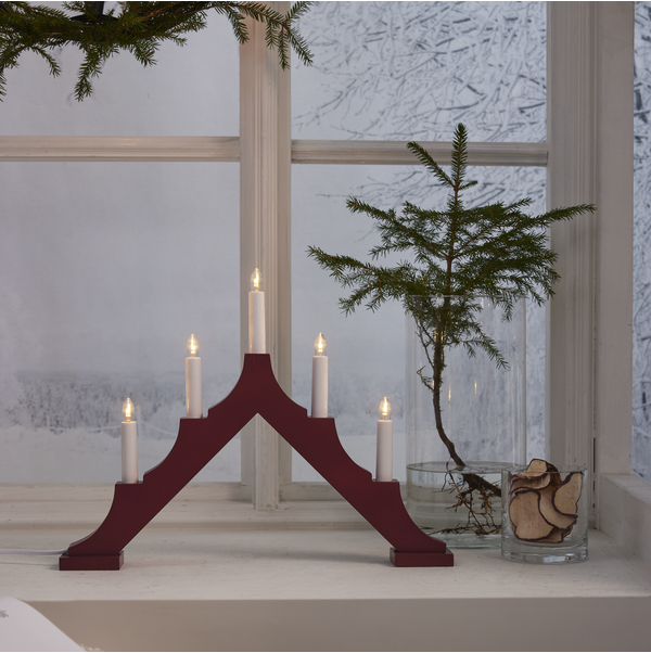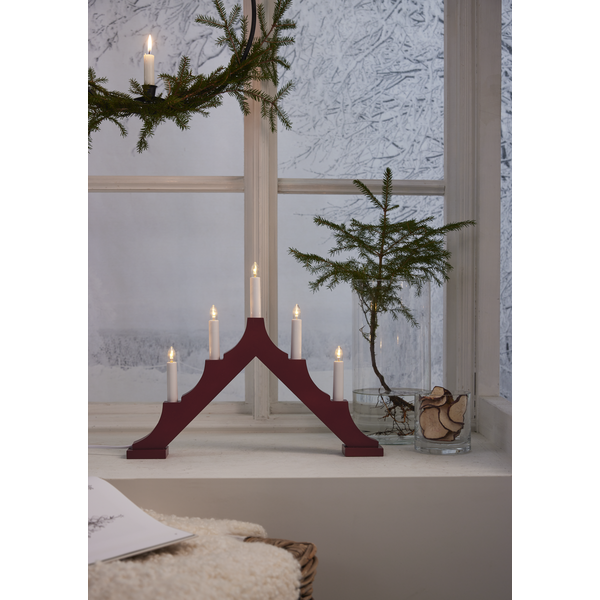 Rød adventsstake laget av tre. Klassisk utformet lysestake med moderne preg. Vakkert lysbilde som skaper den perfekte julestemningen i vinduet ditt. Dette produktet har FSC®-merking.