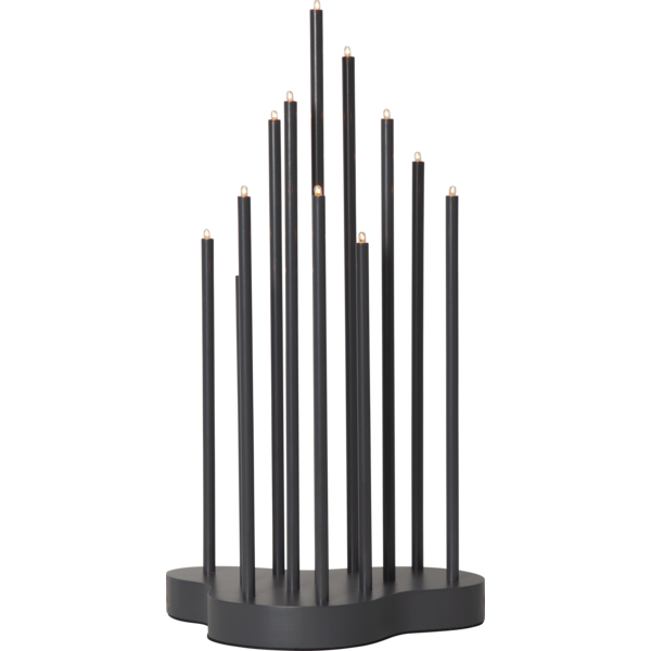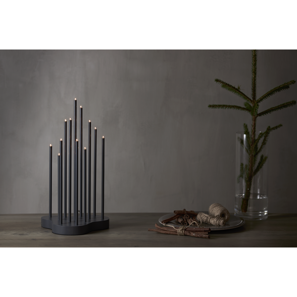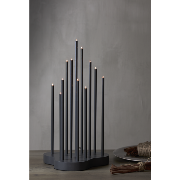 Stilren lysestake med kraftig trebase, lysrør av tynne metallrør. 12 lyskilder, E5-pærer. Hele lysestaken i grafittfarge. Tekstilledning i hvitt/grått. Gir et herlig, stemningsfullt lys året rundt.