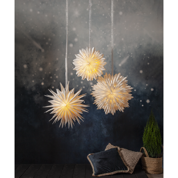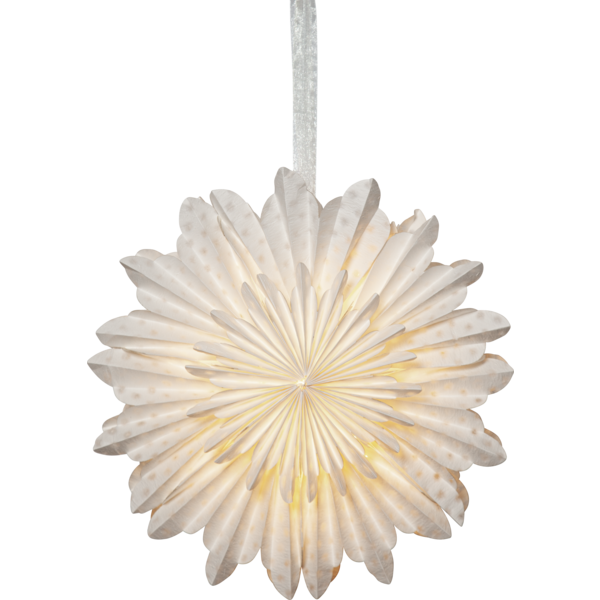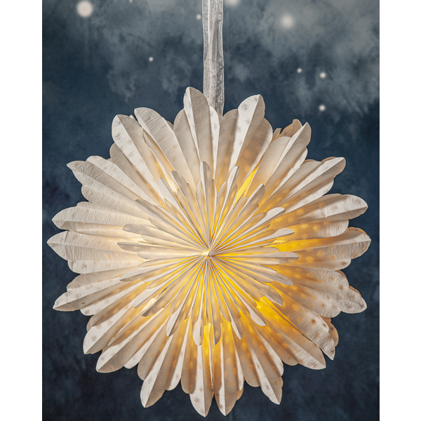 Magisk papirstjerne som er laget av to lag brettet papir. Papiret er laget av resirkulert bomullsspill fra produksjon av t-skjorter. Strukturen i papiret blir derfor myk, og i selve papiret kan man se vannmerkede prikker. Konturen har myke, avrundede fliker. Et elegant bånd følger med for å lettere kunne henge opp stjernen. Stjernen skaper stemning og gir hjemmet den spesielle advents- og julefølelsen. Kan henges både i vindu og på en vegg.