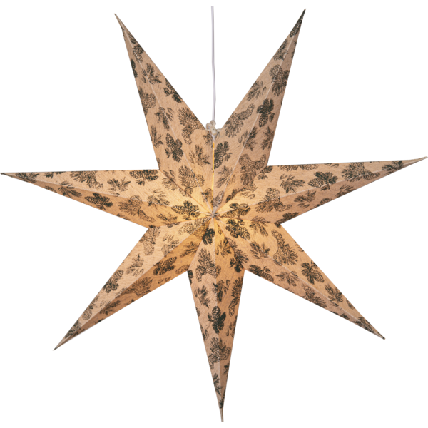 Papirstjerne med FSC®-merking. Den klassiske adventsstjernen har et fint vinterlig mønster i grønt med kongler og granbar. Pynt til advent, og den gir en herlig julestemning. Kjøp til ledningsstativ og lyspære for å få lys i stjernen.