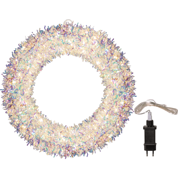 Krans, 30 cm i diameter, med effektfullt skimrende PET-materiale, sprer et mykt lys som skaper en utrolig koselig atmosfære. IP44-klassifisert transformator. Tilgjengelig i to størrelser.