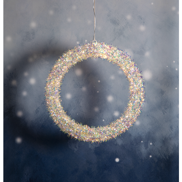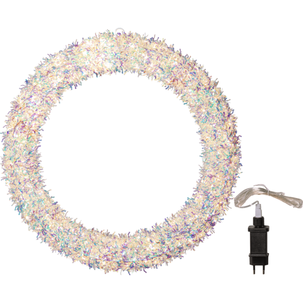 Krans, 45 cm i diameter, med effektfullt skimrende PET-materiale, sprer et mykt lys som skaper en utrolig koselig atmosfære. IP44-klassifisert transformator. Tilgjengelig i to størrelser.