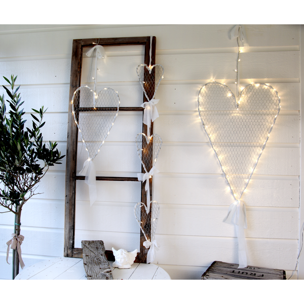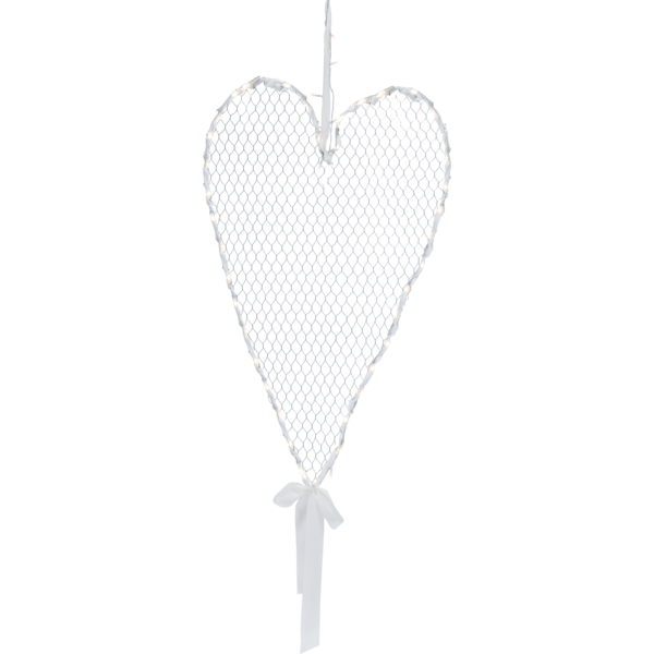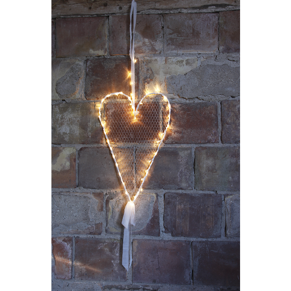 Fint hengende hjerte i rustfritt stål. Dekorasjonen har 40 LED-lys med varmt hvitt skinn. Den innebygde timeren gjør det enkelt å stille inn når hjertet skal lyse.