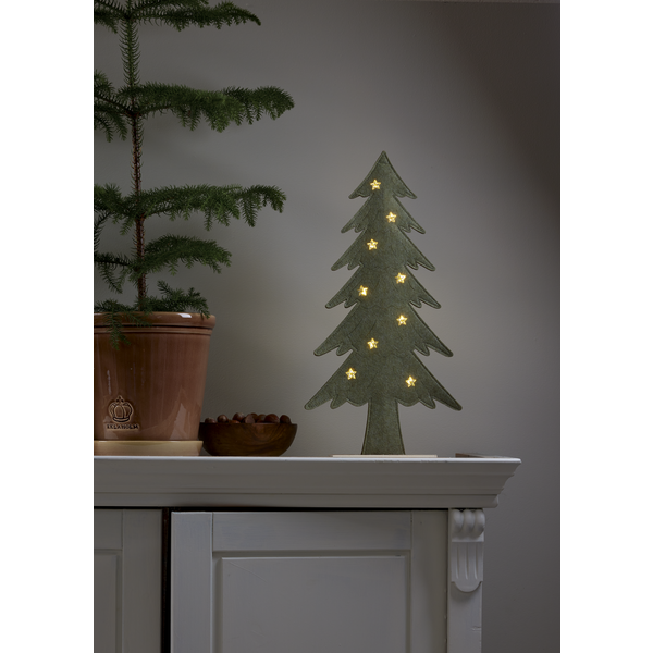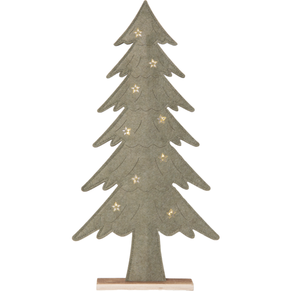 Koselig julepynt i form av et grantre laget av filtmateriale. Små LED-punkter lyser fint i det utskårne stjernemønsteret. Basen er laget i tre. Vakker dekorasjon som er lett å plassere, lyser fint og skaper julestemning. Drives av batteri og har timer.