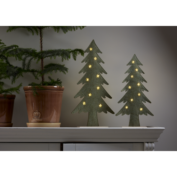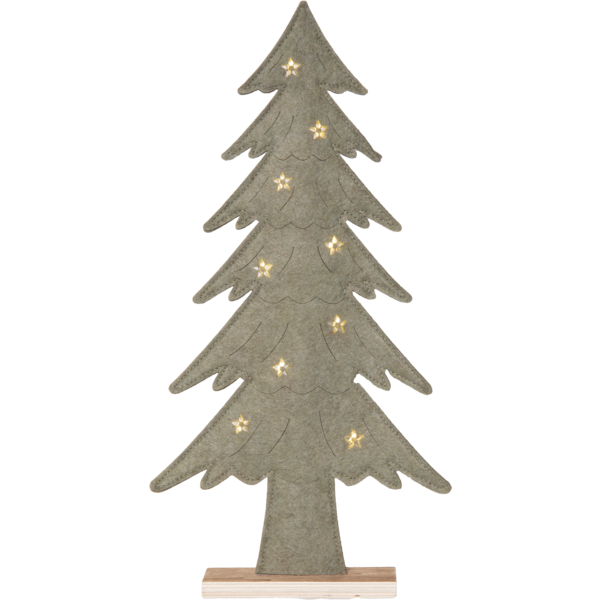 Koselig julepynt i form av et grantre laget av filtmateriale. Små LED-punkter lyser fint i det utskårne stjernemønsteret. Basen er laget i tre. Vakker dekorasjon som er lett å plassere, lyser fint og skaper julestemning. Drives av batteri og har timer.