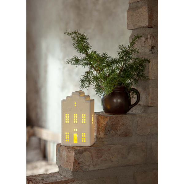 Et vakkert kanallhus i keramikk til dekorasjon i hjemmet. Lyser og sprer et fint skinn. For innendørs bruk.