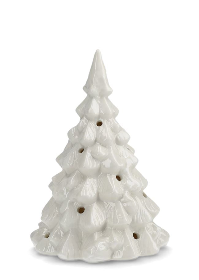 En gran med LED-lys som blir en fin måte å pynte hjemmet til jul. Lagert i keramikk.