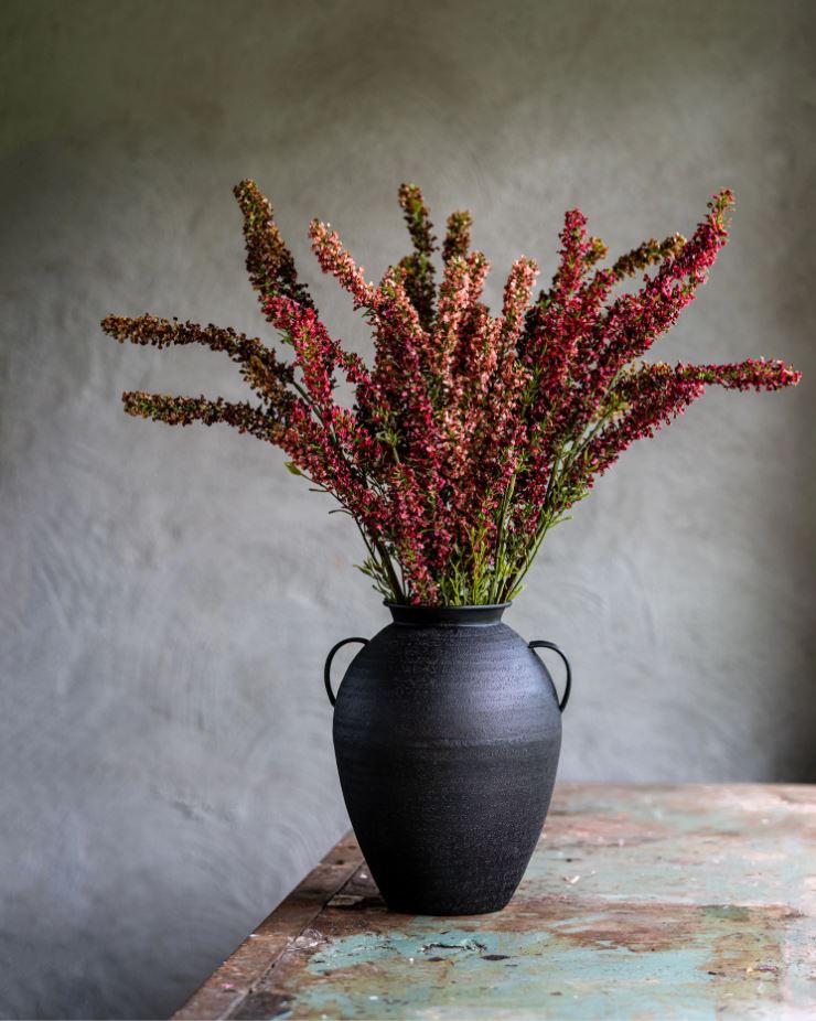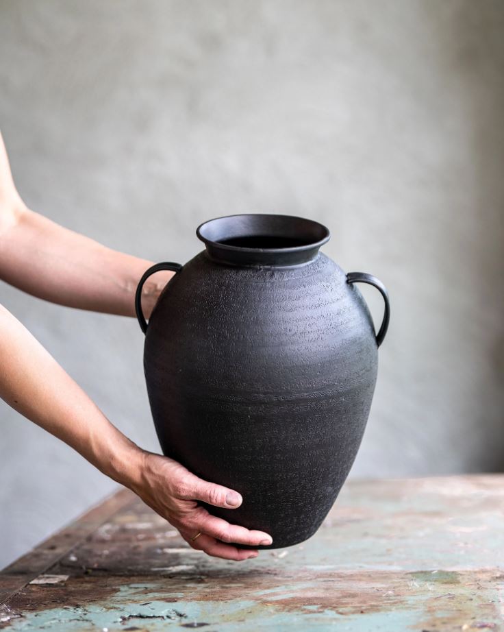 En fin urne som blir en vakker dekorasjon som den er eller kanskje med tørkede planter. Laget av metall