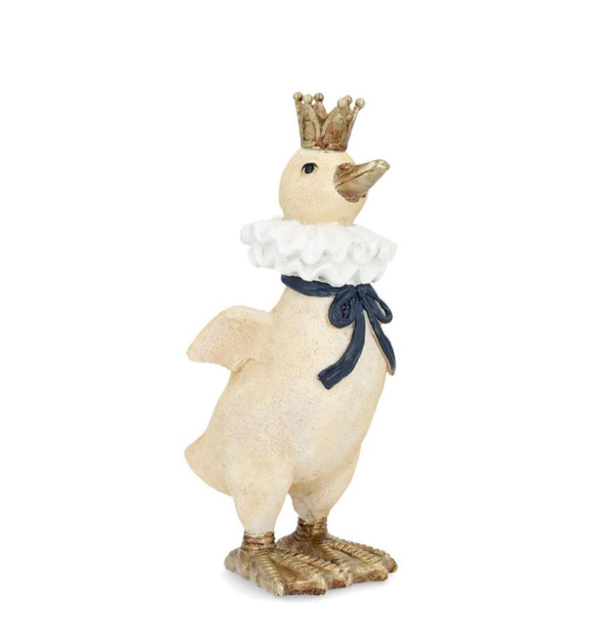 Få en fin dekorasjon til vinduet eller sofabordet med en andunge med krage rundt halsen og krone på hodet. Laget i poly.