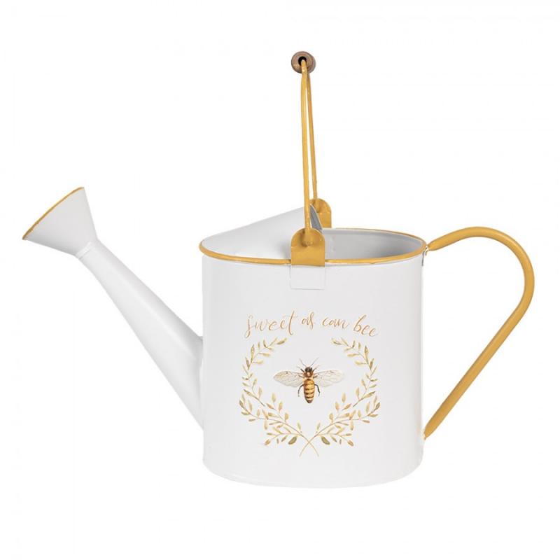 Vakker hvit metall vannkanne med biemotiv som hagepynt.