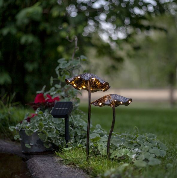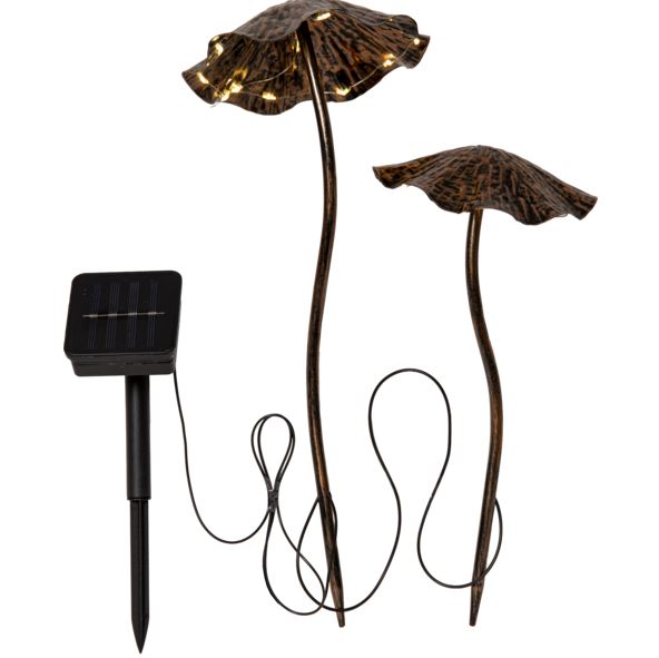 Solcelledekorasjon i form av 2 sopper laget i bronsemalt metall. Under hver sopphette sitter små mikro-LED som lyser med et varmt hvitt lys når mørket faller, 10 LED under den ene og 12 LED under den andre. Batteriet som følger med lades av solen i løpet av dagen og gjør at dekorasjonen lyser når det blir mørkt. Solcellepanelet sitter med 100 cm kabel fra den siste soppen, noe som gjør det enkelt å plassere panelet i solen og dekorasjonen på ønsket sted.