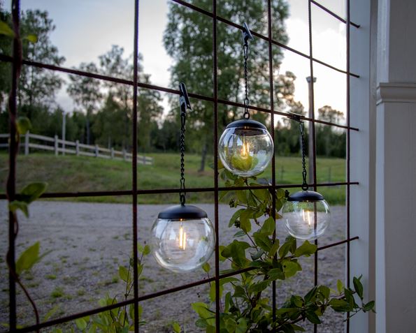 Solcellebelysning Globe er laget av transparent PS-plast som lett kan henges opp ved hjelp av den medfølgende kjeden og krokodilleklemmen. Denne hengende solcelledekorasjonen lyser opp med filament LED i varmt hvitt lys i mørket. Solcellebelysningen passer utmerket som dekorasjon i hagen, på balkongen eller terrassen. Plasser solcelledekorasjonen der solen kan nå panelet i løpet av dagen for å få optimal lading av det medfølgende batteriet.