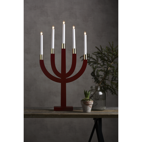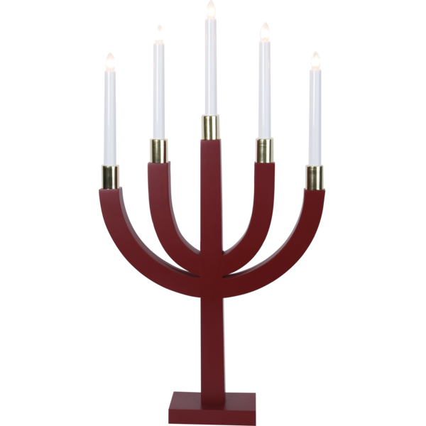 Rød lysestake av tre med messingbunn på lysene. Plasser for eksempel lysestaken i vinduet for å skape en fantastisk adventstemning i hjemmet.
