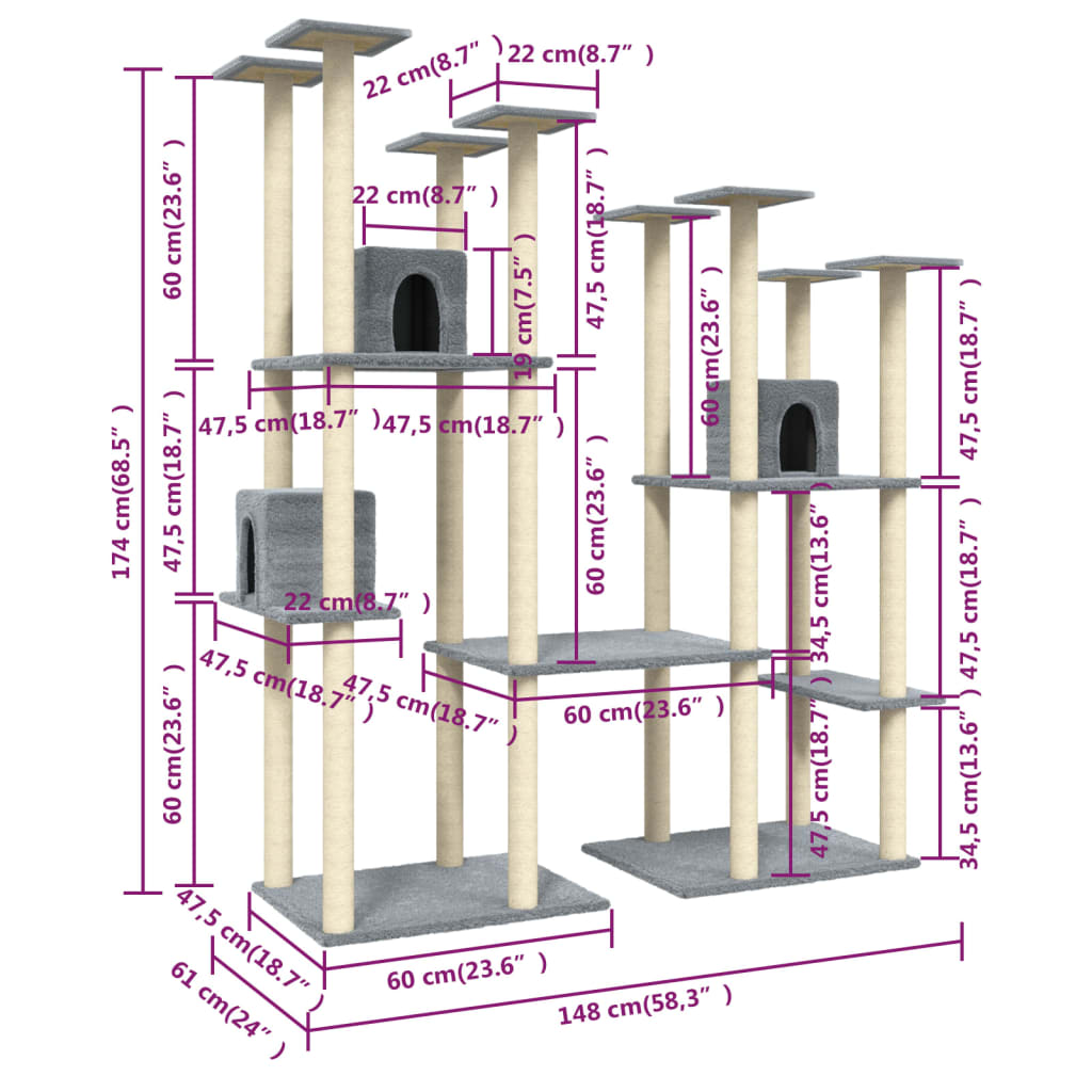 Kattemøbel Kattetre med klorestolper i sisal lysegrå 174 cm