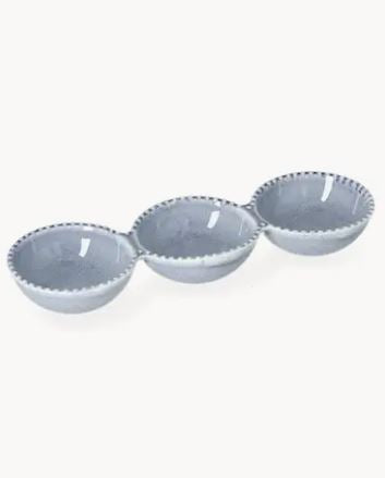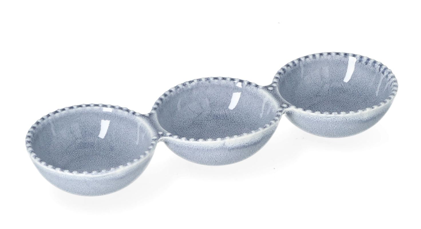 Denne tredelte skålen er perfekt for å servere nøtter eller grønnsaker. Laget av steingods. Finnes i flere farger. Finnes også som serveringsfat og tallerkener.
