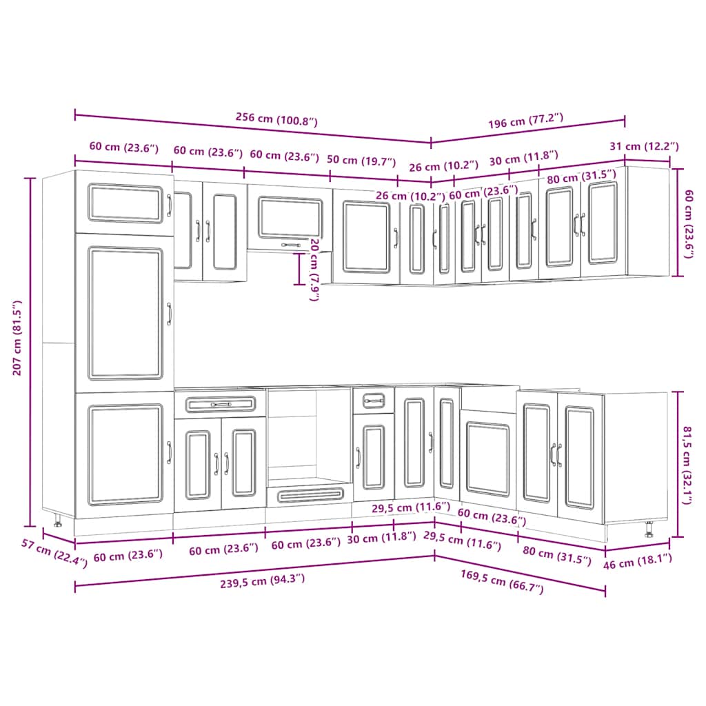 - 1 x kjøkkenvegg hjørneskap: 57 x 57 x 60 cm (B x D x H)