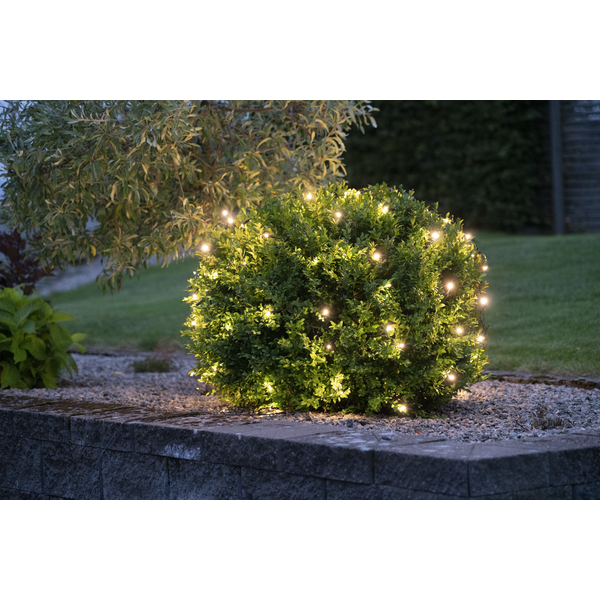 Netto 0,8x1,5m med 40 varme hvite lyspunkter med batteriboks for både innendørs og utendørs bruk, drevet av 3xAA-batterier. For optimal batterilevetid har nettverket en repeterende timerfunksjon, 6 timer på og 18 timer av. Enkel å plassere i hagen for en vakker glød.
