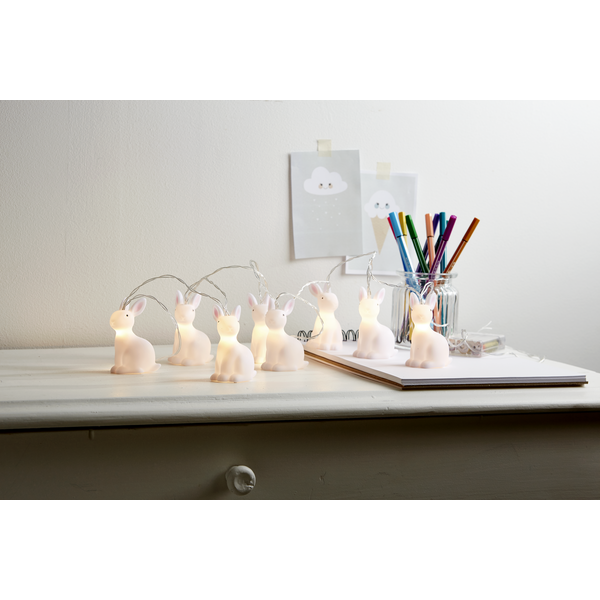 Søt løkke med 10 kaniner på i LED-lys. Kjekt å ha på barnerommet. Den innebygde tidtakeren gjør det enkelt å stille inn når lyssløyfen skal lyse. Betjenes med 3 stk. AA-batterier. Batterier er ikke inkludert.