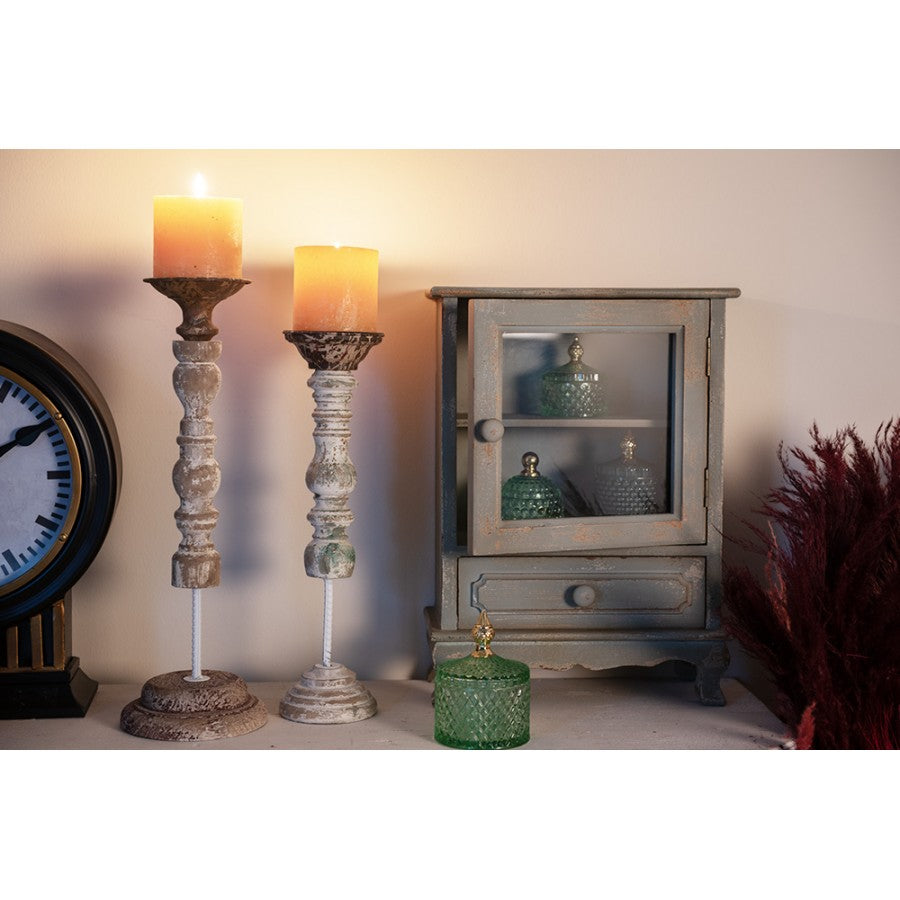 Dekorativ, hvid med brun, lysestage af træ og metal, i landlig stil.