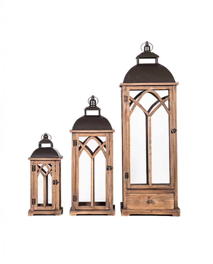 Sett med tre lykter som er perfekte å ha ved inngangen eller i uterommet.Laget av tre og glass.
