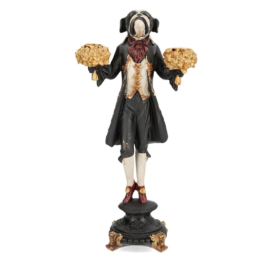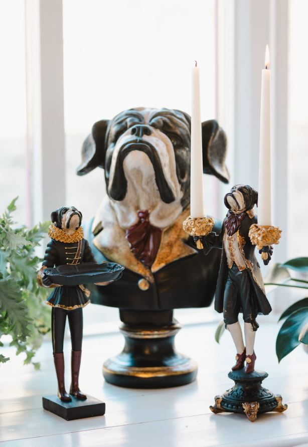 Bulldog som holder to buketter i hendene der lysestakene finnes.