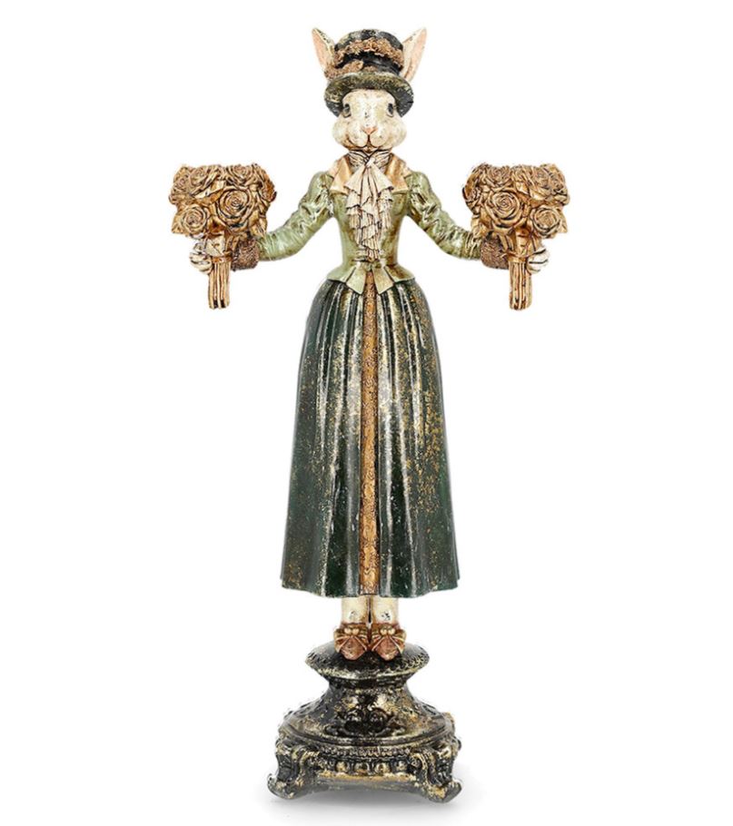Kanin i kjole som holder to buketter i hendene der lysestakene er.