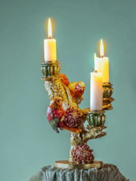 Ljusstake för tre ljus, designad en gren med färgglada fåglar. Ett lekfullt sätt att få in levande ljus i inredningen. Tillverkad i poly.