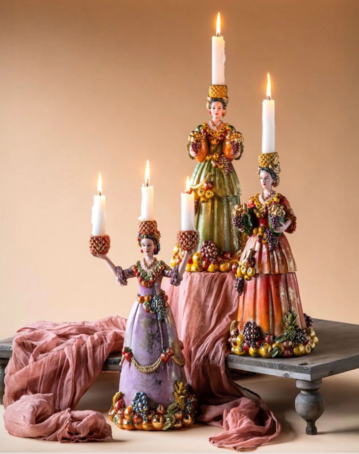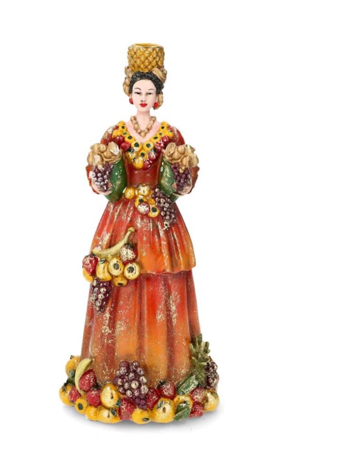 Innred med eleganse og lekenhet med en fin lysestake som forestiller en kvinne i kjole med forskjellige frukter. Laget i poly.