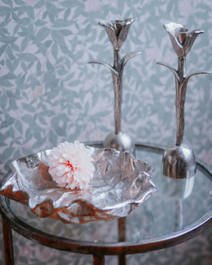 Signe er en fin lysestake formet som en blomst. Sammen med et kronelys sprer den et vakkert skinn av levende lys i rommet. Laget av metall.
