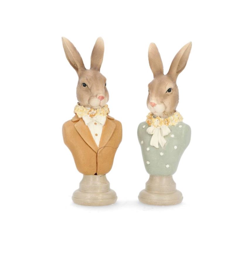To byster med velkledde kaniner. En morsom dekorasjon for hjemmet som også passer til påske. Laget i poly.