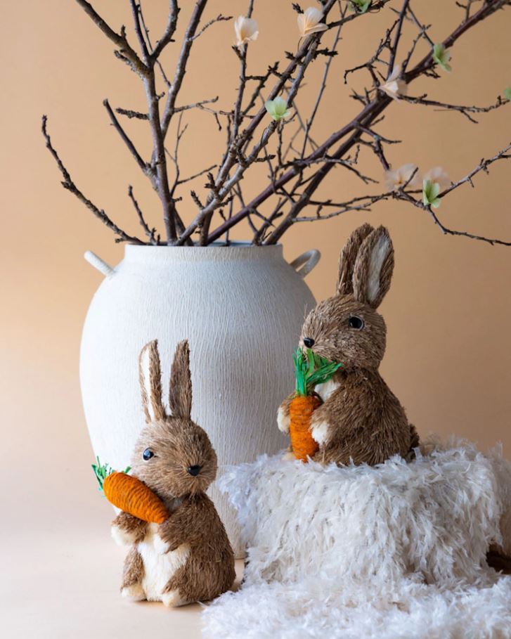 Disse søte kaninene som holder hver sin gulrot blir et lekent innslag i innredningen. Perfekt som påskedekorasjon. Laget av naturlige materialer.