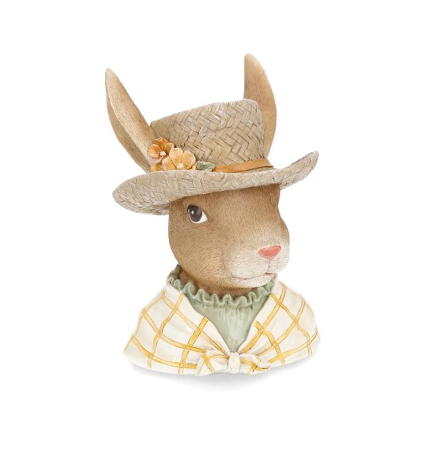 Byste med kanin kledd i hatt. En morsom dekorasjon for hjemmet som også passer til påske. Laget i poly.