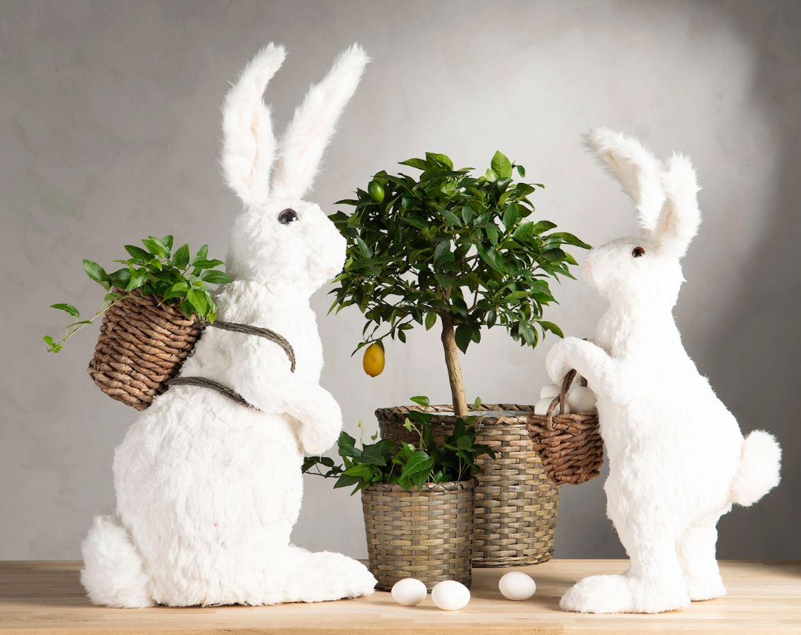 Spre påskestemning med en stor kanin med ryggsekk. Laget av frigolit, tekstil og rotting.