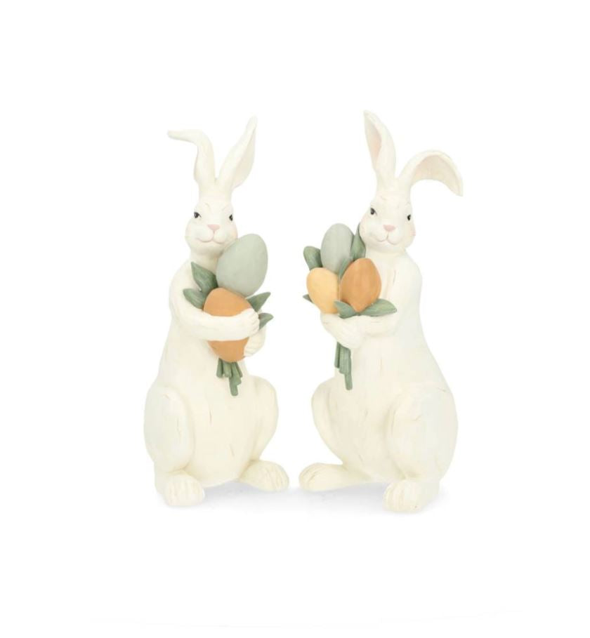Pyntet hjemmet til påske med disse to kaninene som holder en bukett blomster. Laget av poly.