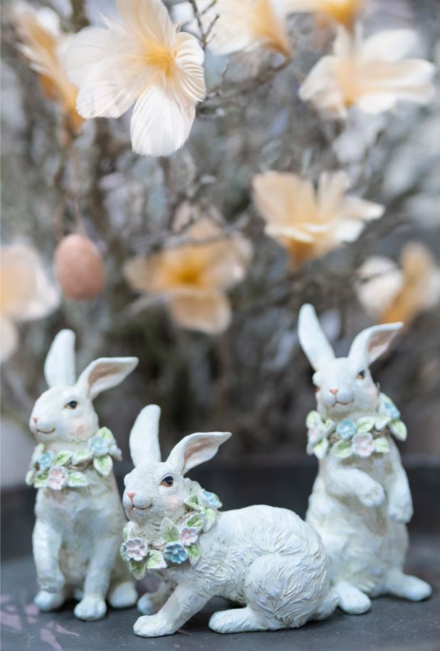 Dette settet med kaniner med en blomsterkrans rundt halsen vil gi en leken touch til hjemmet. Laget av poly.