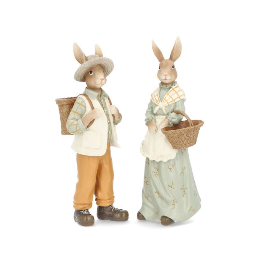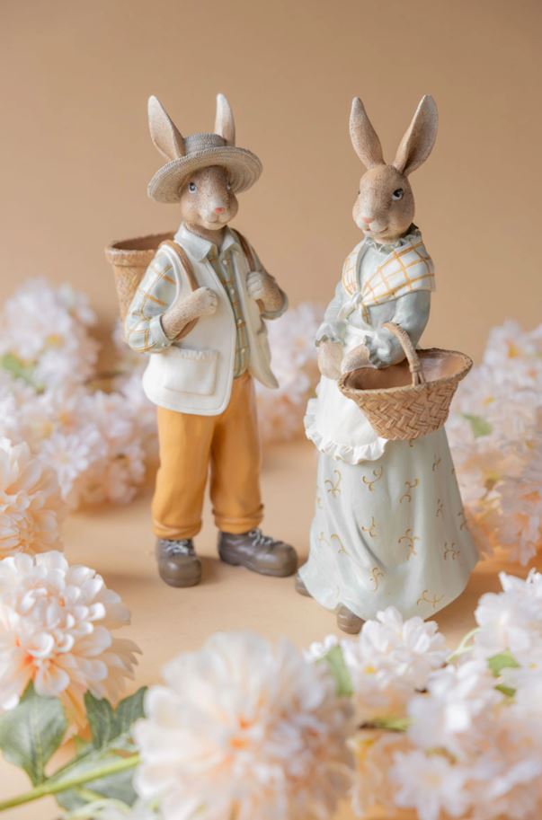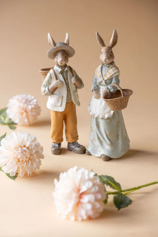 Søtt kaninpar kledd for en utflukt. Perfekt som dekorasjon i vinduet eller på salongbordet. Laget av polyester.