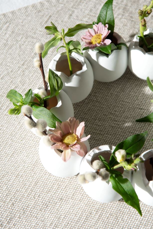 Denne eggringen er en sjarmerende påskedekorasjon som danner små vaser for dine vårblomster. Laget av poly.