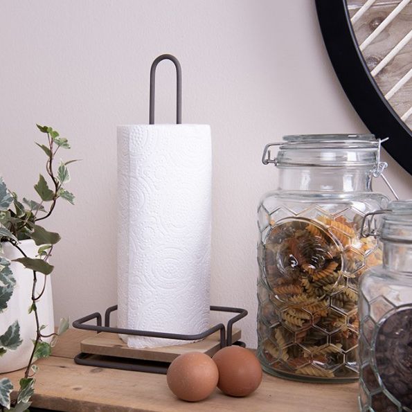 Kraftig kjøkkenrullholder i jern med firkantet trebunn.