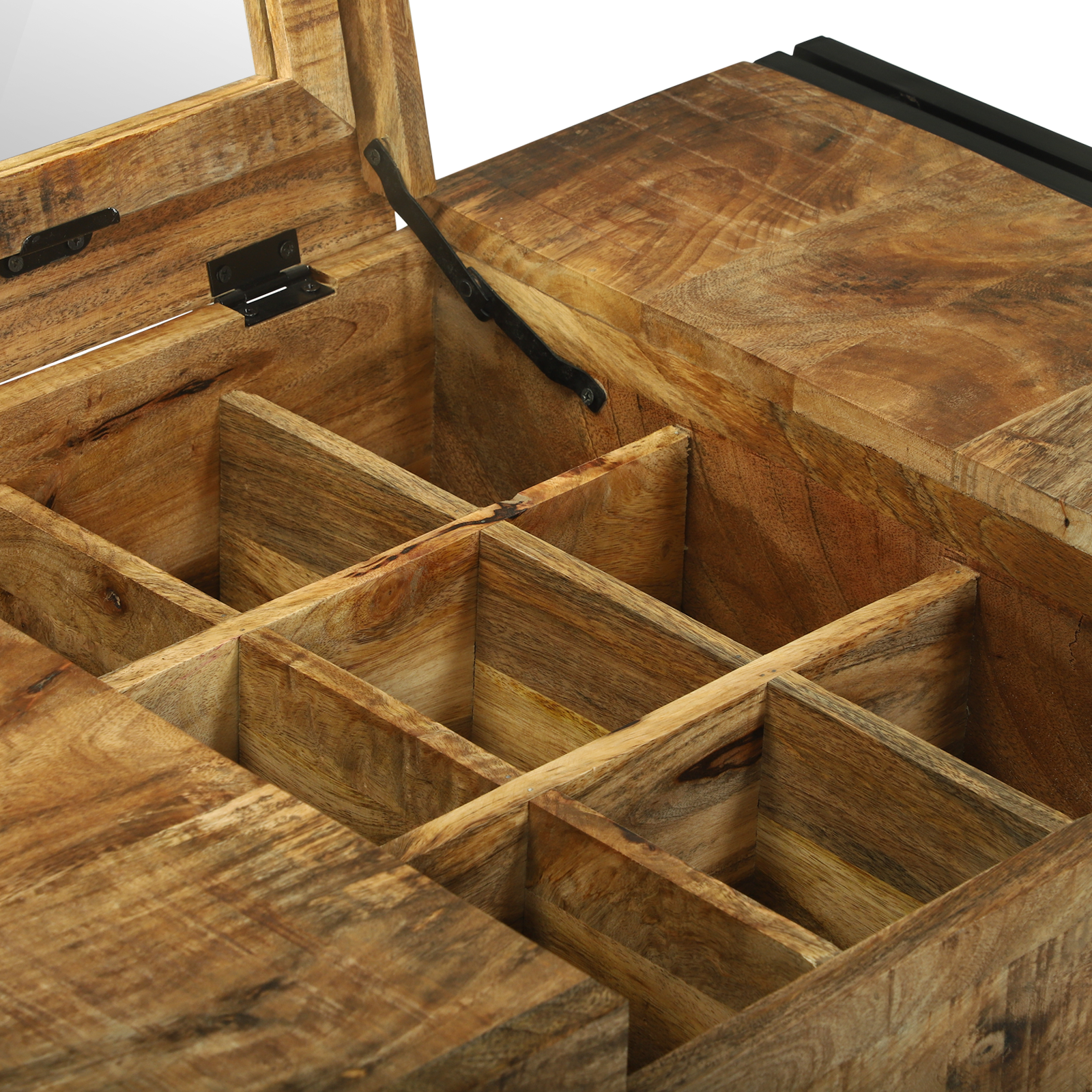 - Holdbare Materialer: Med massivt mangotre og en solid stålramme, er dette sminkebordet laget for å vare.