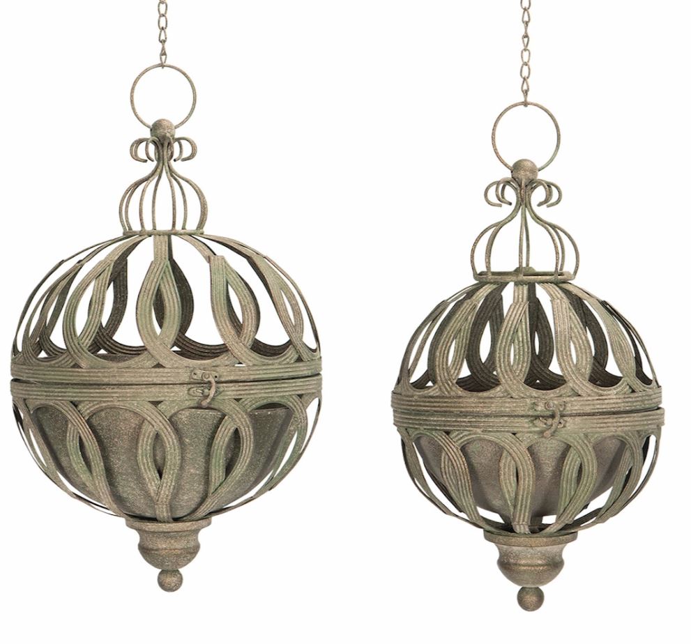 Dette settet med hengende kuler blir en vakker måte å dekorere med planter og grønt på. Laget av metall.