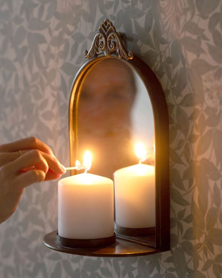Vakre vegglysestake med speil blir en perfekt blanding av dekorasjon og lysestake og henger vakkert på veggen. Laget av speilglass og metall.