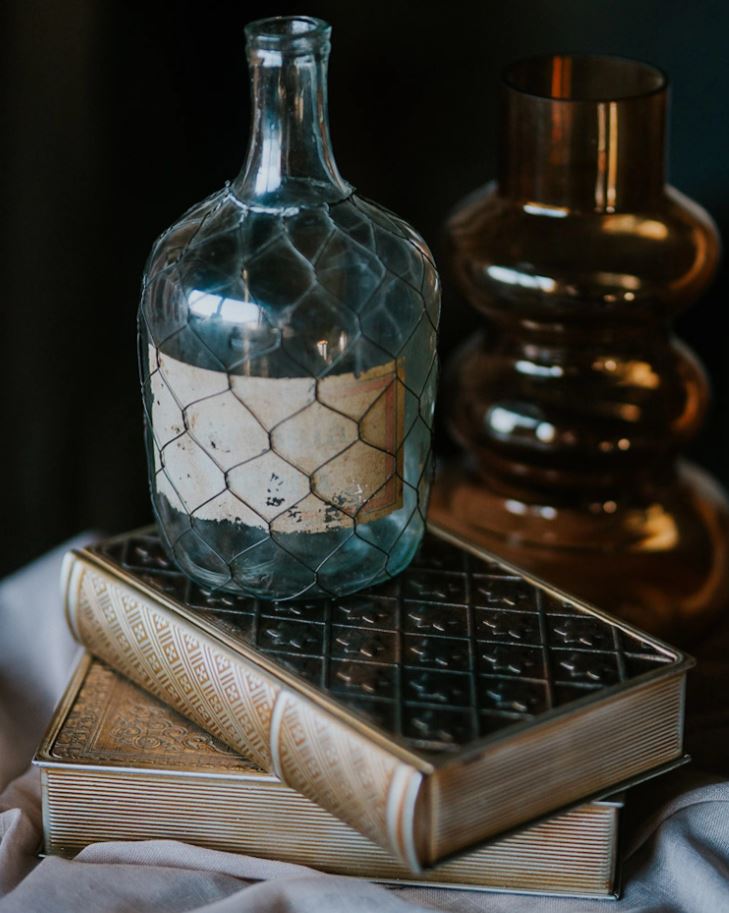 Innred hjemmet med en dekorativ glassflaske med metallnett. Fin å sette små snittblomster i.