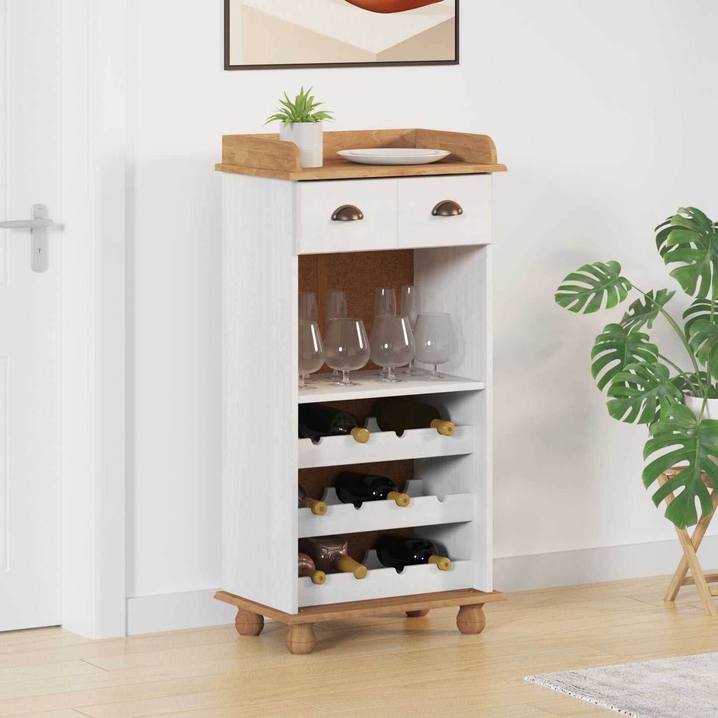 - Denne vinreolen har en stilig blanding av materialer, med en malt hvit struktur og varme tre detaljer som lyser opp rommet. Perfekt for å vise frem favorittflaskene dine, samtidig som alt holdes organisert.