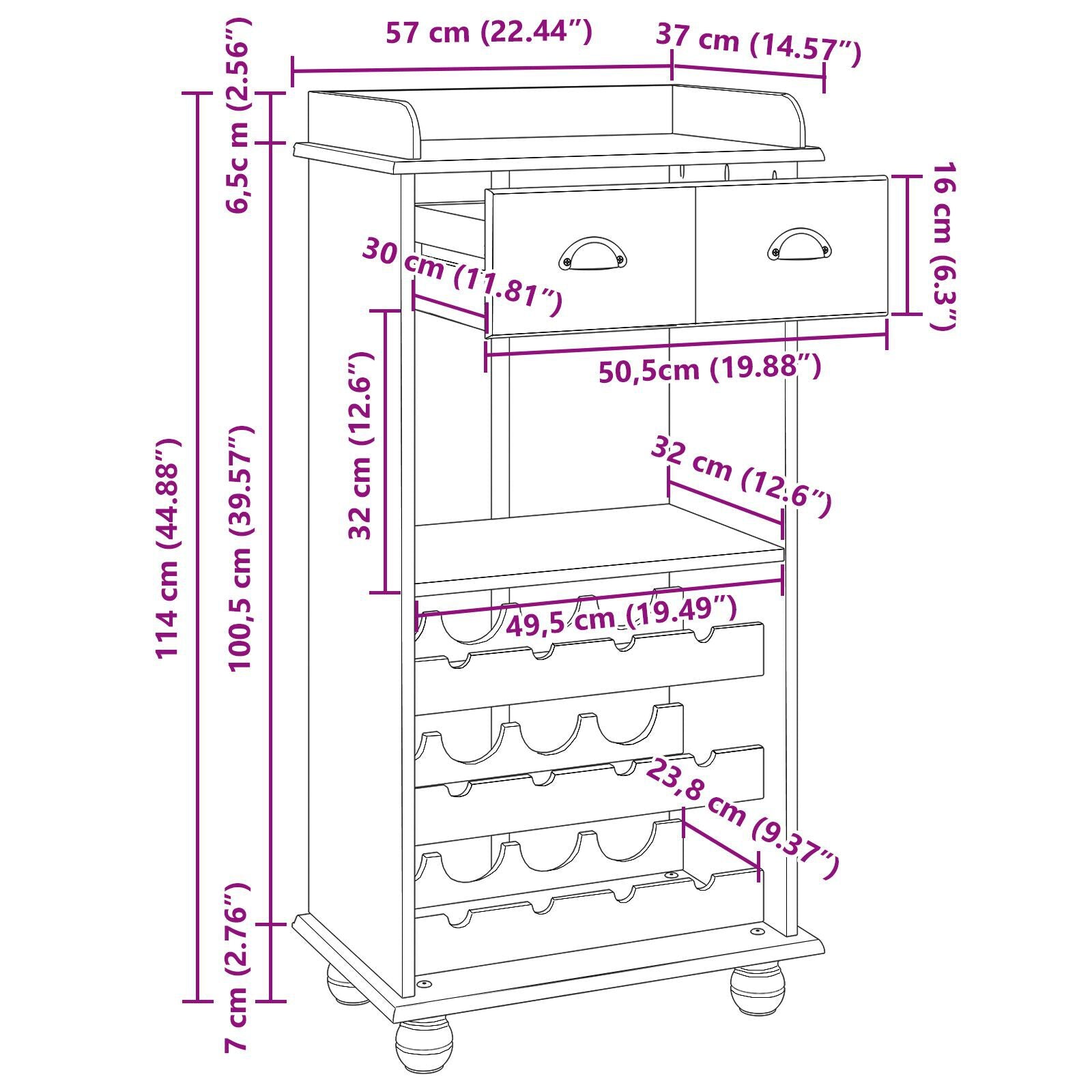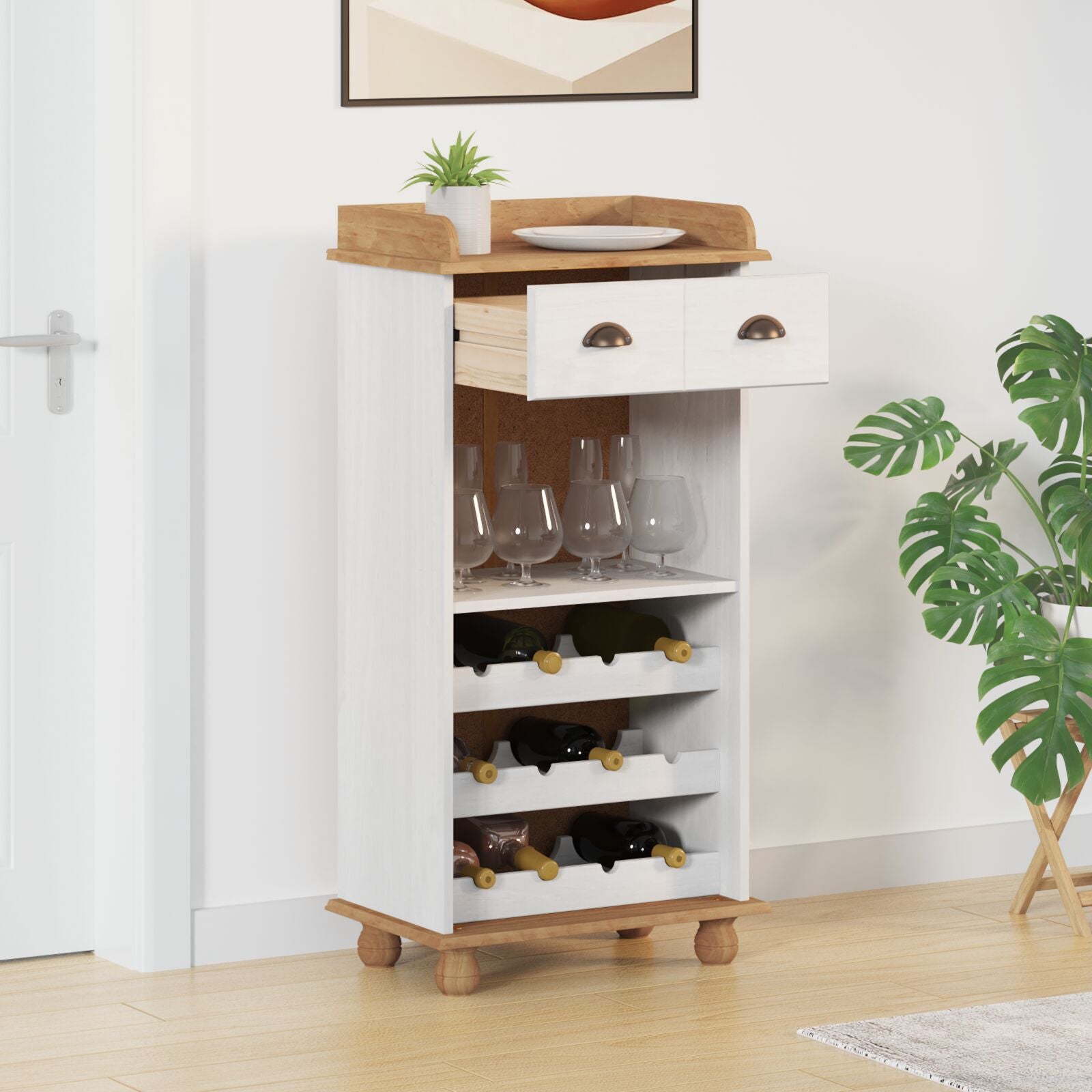 Denne vinreolen ser bra ut med sitt hvite og tre-design, og blander stil og funksjon for hjemmebaren eller spiseområdet. Den glatte finishen og moderne utseendet gjør den til et midtpunkt som hever interiøret, samtidig som den lagrer vinen din på en smart måte.